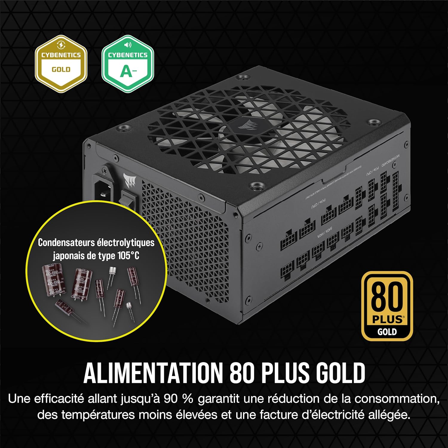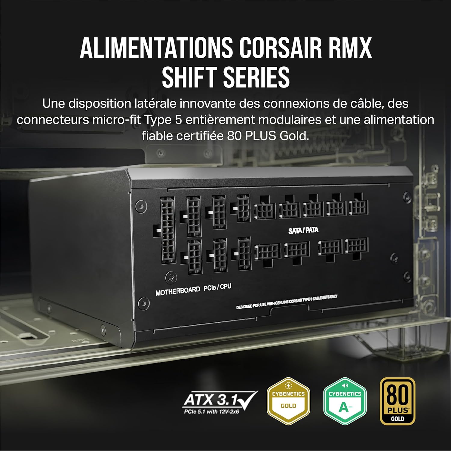Les blocs d’alimentation entièrement modulaires CORSAIR RMx SHIFT Series sont dotés d’une interface de câblage latérale révolutionnaire pour vous aider à garder toutes vos connexions à portée de main tout en bénéficiant d’une alimentation efficace 80 PLUS Gold. Les connecteurs Micro-Fit entièrement modulaires de l’alimentation RMx SHIFT et sa conformité avec la norme ATX 3.1 facilitent encore davantage l’assemblage et la mise à niveau du PC pour un résultat impeccable. Les blocs d’alimentation RMx SHIFT intègrent des condensateurs électrolytiques 105 °C japonais synonymes de durabilité et de fiabilité et assortis d’une garantie de dix ans. Un ventilateur à roulement hydrodynamique de 140 mm utilise une courbe de ventilation spécialement calculée pour apporter un haut niveau de performance et de fiabilité associé à un faible niveau sonore, tandis que la prise en charge du mode Zero RPM assure un fonctionnement presque inaudible à faibles et moyennes charges. Pour une alimentation silencieuse, efficace et accessible, faites le choix d’un bloc d’alimentation RMx SHIFT Series.
